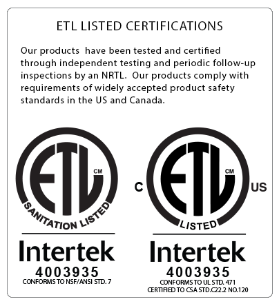 Intertek ETL Listed and NSF compliant to North American product safety standards and required sanitation standards.