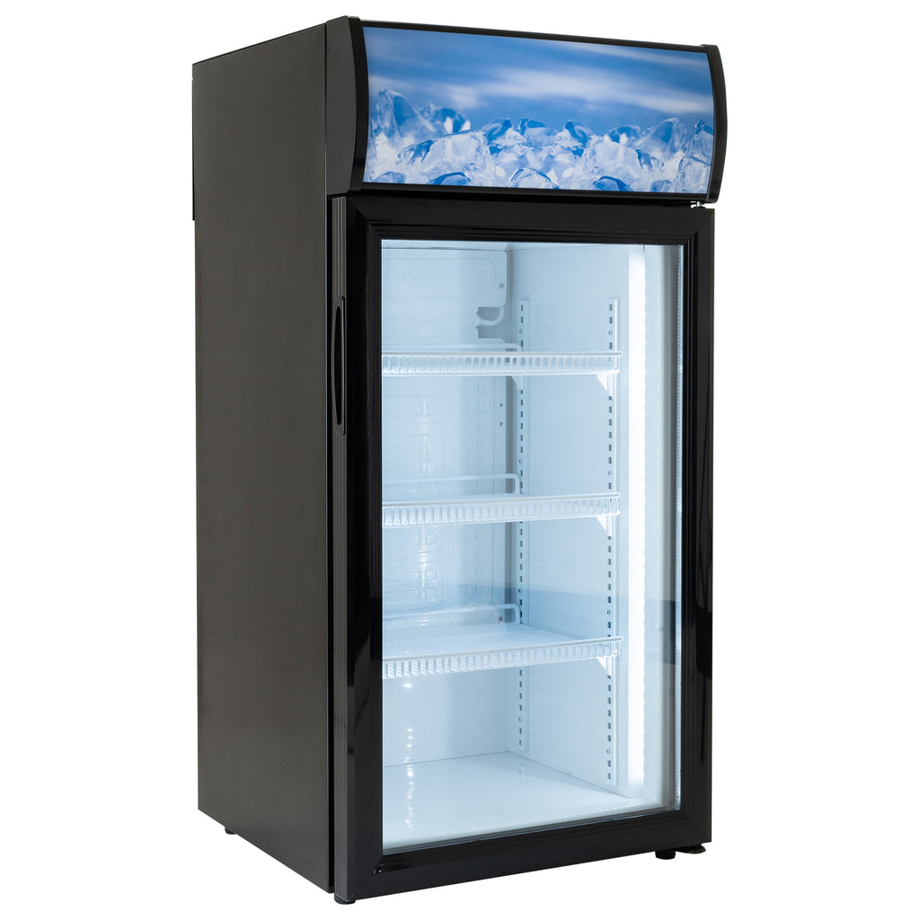 Black Diamond's Countertop Display Refrigerator exemplifies top-tier quality, designed for reliability and efficiency in busy commercial settings. Crafted with a PVC glass door, this compact refrigerator offers a clear view of beverages, prepackaged food, sandwiches, salads, and snacks, making it ideal for impulse buys. The durable black-coated steel exterior and robust ABS plastic interior ensure longevity, while the foamed-in-place polyurethane-cell insulation maintains temperatures between 32° and 50°F. With a 2.7 cubic foot capacity, this small countertop refrigerated display case is perfect for showcasing a variety of items, from beverages to snacks, on its three adjustable epoxy-coated shelves. The compressor-powered cooling system and environmentally friendly R600A refrigerant work efficiently to keep contents at the desired temperature. This commercial countertop cooler operates on 110 volts with a Type B plug, providing convenience in any foodservice setting. Its mechanical control allows for easy temperature adjustments, and the manual defrost system ensures hassle-free maintenance. Designed to fit seamlessly into any counter top fridge commercial environment, this table top refrigerated display case is compact yet spacious enough to meet your needs. The absence of casters enhances its stability on any countertop. Measuring 18.1"L x 18.5"W x 36.7"H, this countertop display fridge is covered by a one-year limited warranty, offering peace of mind. It is cETL and ETL listed, ensuring safety and performance. The sturdy construction and efficient design make it an asset in any commercial setting. Whether used as a countertop deli case or a countertop cold food display, this commercial countertop display refrigerator is a reliable choice for foodservice professionals. The Black Diamond countertop display refrigerator with glass door is not just a fridge but a strategic asset for boosting sales through impulse buys. Black Diamond is the value-driven choice for commercial-grade gas cooking equipment, offering both standard and heavy-duty options that outshine other value brands, and also featuring specialty refrigeration for specific cooling applications. From high-performance gas ranges, fryers, griddles and more, to specialty refrigeration like open-air merchandisers, chest freezers, and ice cream cabinets, Black Diamond provides durable, cost-effective solutions to meet the diverse needs of any kitchen.